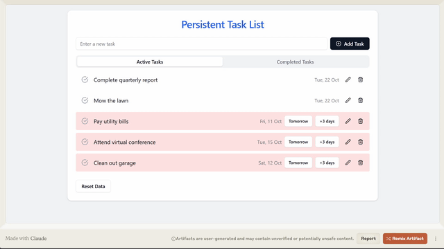 Applications are significantly more valuable when they can store and load data between sessions. Artifacts can use the Browser’s Local Storage to persist data3.