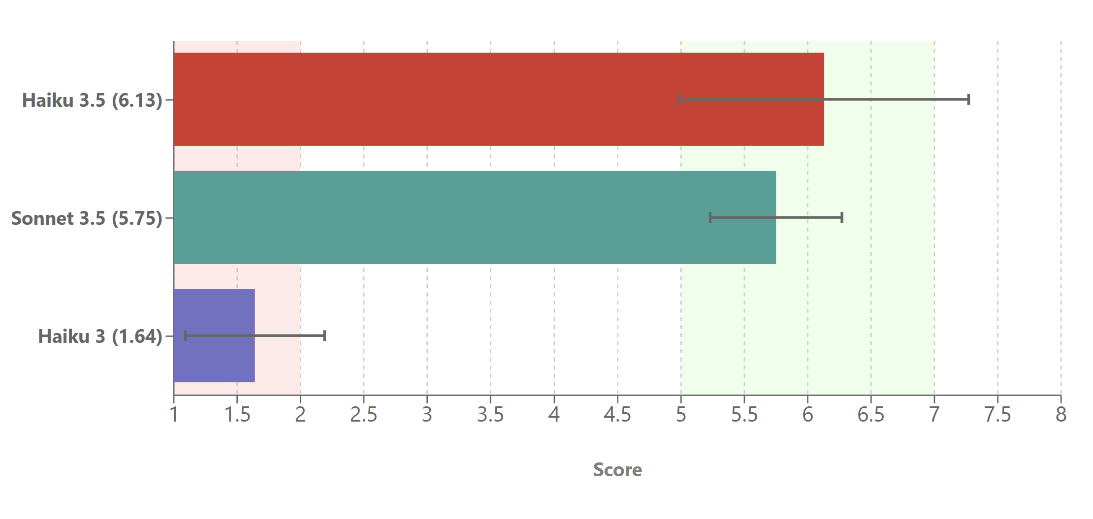 The below scores show Haiku 3.5 compared with the refreshed Sonnet 3.5 and the original Haiku 3. The same prompt was run 200 times with You are a helpful AI Assistant system prompt and the API default temperature of 1.